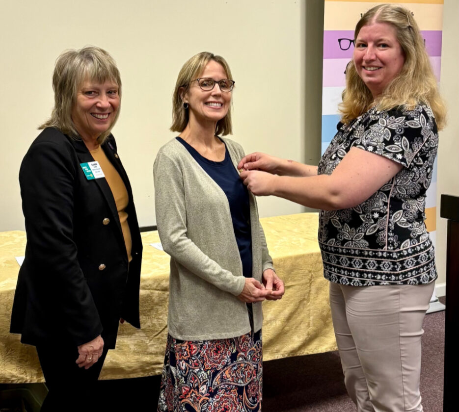 PHOTO PROVIDED Cathy Ballat, center, receives her Rotary pin from Lisa Schropp, president of the Rotary Club of Downtown Lock Haven. Cathy became the club’s newest member Sept. 30 when she was inducted by Rotary District Governor Dawn Linn, left.