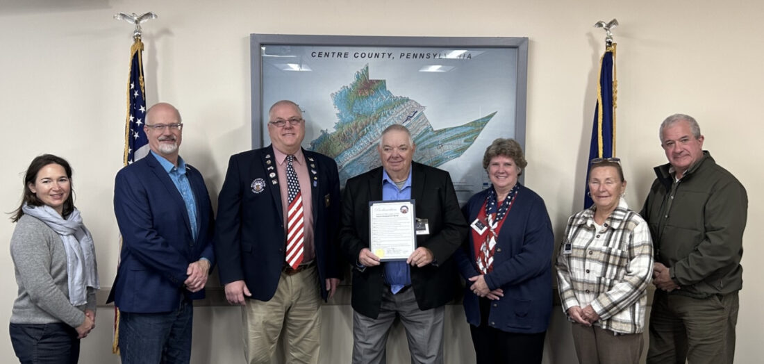 At the Centre County Board of Commissioners meeting on Thursday, Nov. 13, the Commissioners signed an Elks Veterans Remembrance Month Proclamation. In attendance was PPDGER and Air Force Veteran Adam Rawding, who outlined the programs the Elks do for the Veterans, the Welcome Home Kits, the Leather Kits and the visits to Centre Care. He also touched on the many other Elks programs such as support for the youth, community and local charitable organizations. Pictured from left are, County Commissioner Amber Concepcion, Vice Chair, County Commissioner Mark Higgins, Chairman, Elks PDDGER Adam Rawding, Elks Veterans Service Committee Chairman Rick Hoffman, Elks PER and Trustee Terree Michel, Trustee Cathy Hoffman and County Commissioner and fellow Elk Steve Dershem.