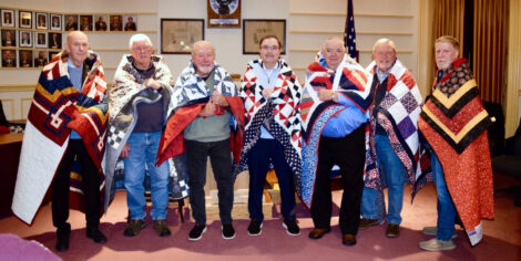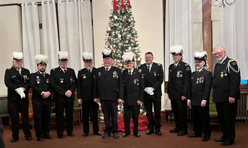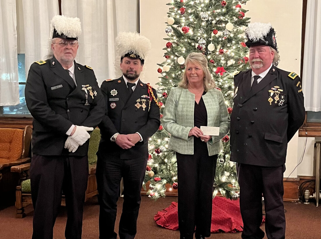 Sir Knights of Hospitaller Commandery held their Christmas Observance at the Masonic Temple, 150 E. Main St., Lock Haven, where they presented Holly Beaver of the New Love Center with a donation of $875 to go towards their food bank. The Sir Knights have a motto of feed the hungry, clothe the naked and bind up the wounds of the afflicted, and they have taken that out into the community as they continue to raise funds and awareness for local charities. Pictured from left are Knights of Templar Dennis McKibben, Brenden Hunter, New Love Center representative Holly Beaver and Jack Becker.