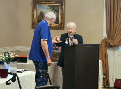 PHOTO PROVIDED 14-G District Governor Leona Houseknecht gives the award to Milesburg Lions Club President, Ralph Williams.