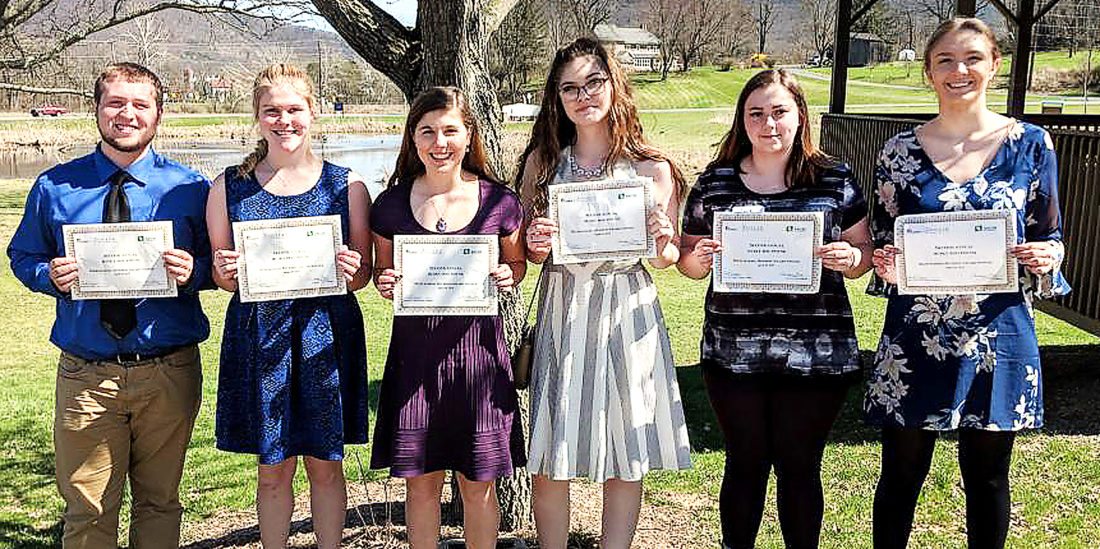Members of the group are shown above, Pictured above, from left, Zane Dutton, Hannah Weaver, Jessica Piergallini, Taryn Kimball, Carolyn Vonada, and Brittnee Winslow with winning certificates from the “Shark Tank” competition at Bloomsburg University.