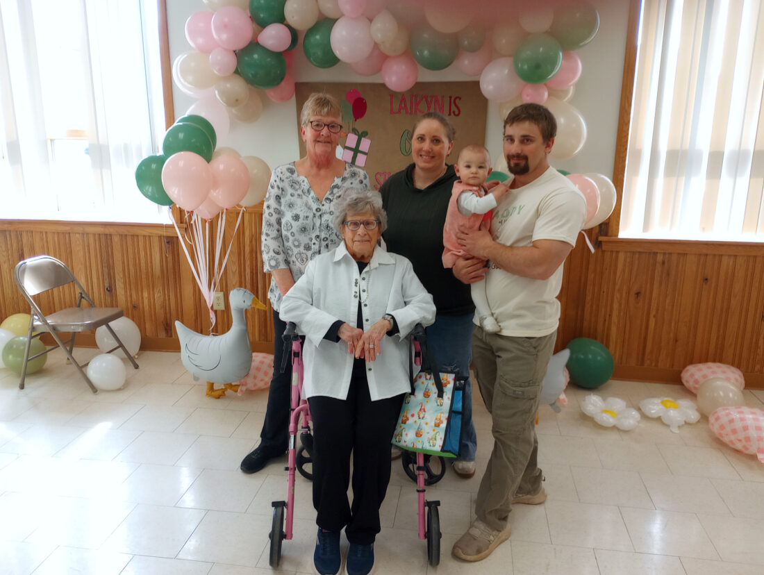 On Saturday, March 7, Laikyn Nyman celebrated her first birthday and was able to have four other generations of her family there for the milestone. Pictured are five generations of the family. They are, seated, Pat Stover, the great-great-grandmother of Laikyn. Back row from left, is Cathy Nyman, great-grandmother; Lindsey Nyman, grandmother; and Aleck Nyman, Laikyn’s father.