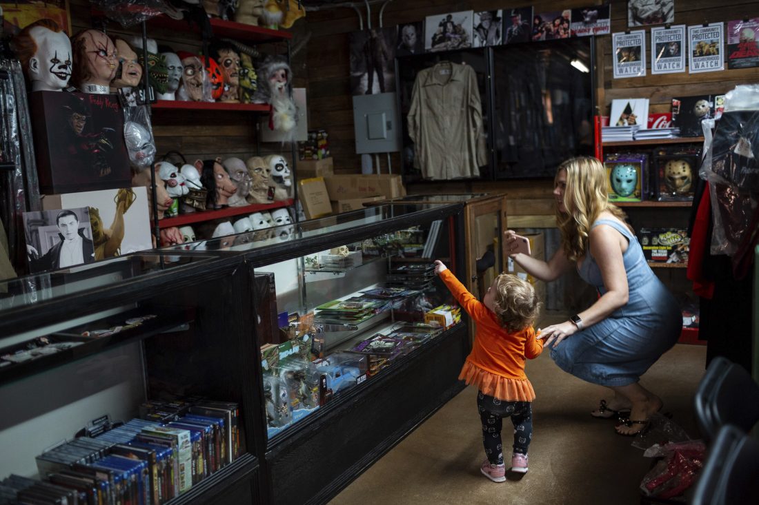 Spencer Selvidge/The San Antonio Express-News via AP Lindsay Liles and her 18-month-old daughter, Collette, from Los Angeles, look at masks at The Gas Station, famous for its appearance in the cult horror classic, "The Texas Chain Saw Massacre," in Bastrop, Texas.