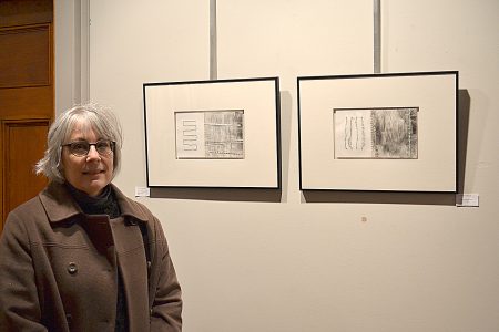 RICK KESSINGER/THE EXPRESS The newest art professor at Lock Haven University, Kathryn Anderson, standing with two works from her Amnesia series.