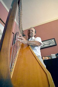 LAURA JAMESON/THE EXPRESS Jaime Castillo performs a piece on his classical harp in his Woolrich home.