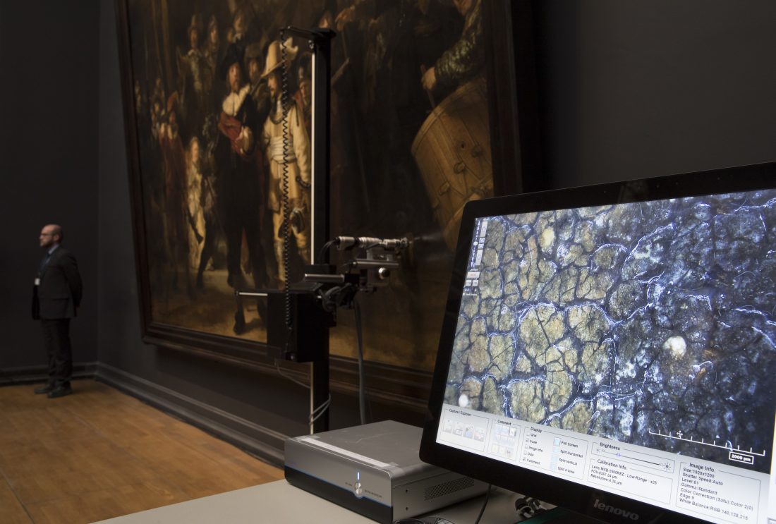 AP Photo/Peter Dejong, File A microscopic image enlarging a 4x6 millimeter part of the painting on Rembrandt's Night Watch, which will be restored next year in the public eye, is seen on a screen next to the painting at the Rijksmuseum in Amsterdam, Netherlands, Tuesday, Oct. 16, 2018.