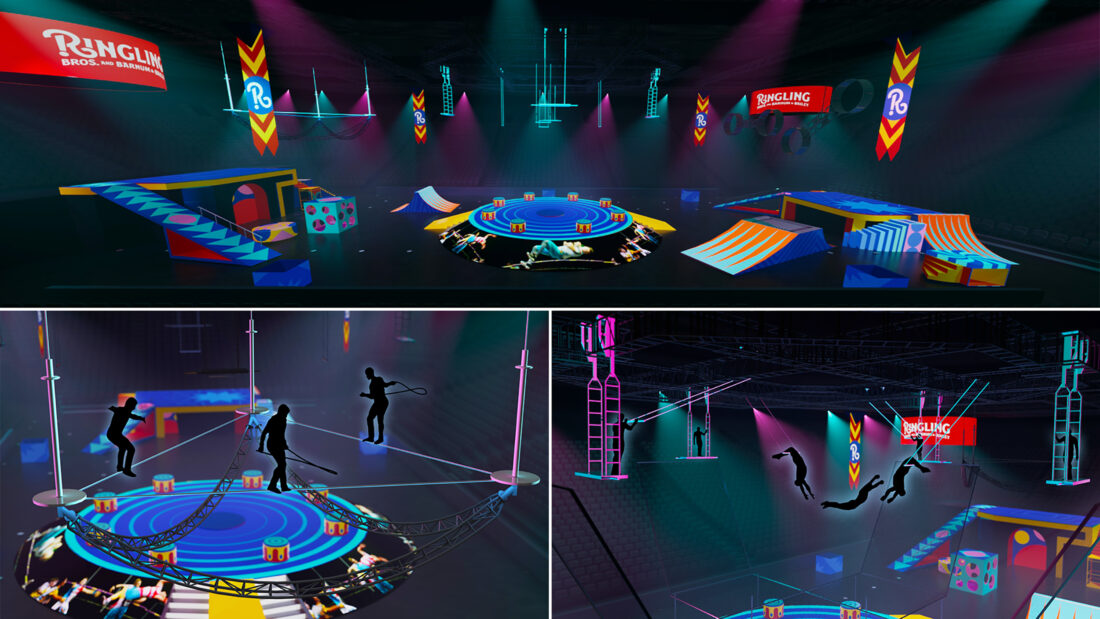 This combination of photos shows art renderings for the reimagined Ringling Bros. and Barnum & Bailey circus, reborn without animals. The show, which will offer highwire tricks, soaring trapeze artists and bicycles leaping on trampolines, kicks off its 2023 North American tour this fall. (Ringling Bros and Barnum and Bailey via AP)
