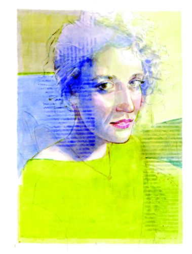 In her artist statement she explains, “My focus is the human face and figure but my paintings are more than portraits. I hope to intrigue and invite the viewer to imagine their own story. Drawing is an important part of my process, and the underpinning lines are often left visible and even enhanced. After many years of painting realistically I now forfeit control and let intuition guide me. Layers of thin watercolor washes build a sense of atmosphere and mystery. The uneven edges hold a relationship with the paper, fading in and out, allowing the composition to grow and breathe.”