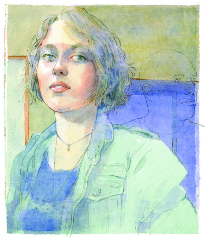 In her artist statement she explains, “My focus is the human face and figure but my paintings are more than portraits. I hope to intrigue and invite the viewer to imagine their own story. Drawing is an important part of my process, and the underpinning lines are often left visible and even enhanced. After many years of painting realistically I now forfeit control and let intuition guide me. Layers of thin watercolor washes build a sense of atmosphere and mystery. The uneven edges hold a relationship with the paper, fading in and out, allowing the composition to grow and breathe.”