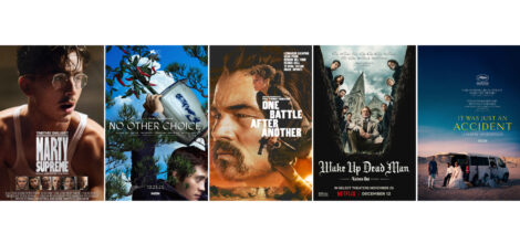 This combination photo shows promotional art for the films, "Marty Supreme," from left, "No Other Choice," "One Battle After Another," "Wake Up Dead Man: A Knives Out Mystery," and "It Was Just an Accident." (A24/Neon/Warner Bros./Netflix/Neon via AP)
