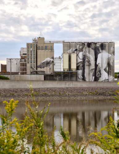 MINOT, N.D. (AP) — High atop a massive grain elevator in the middle of Minot, North Dakota, artist Guido van Helten swipes a concrete wall with a brush that looks more appropriate for painting a fence than creating a monumental mural.
