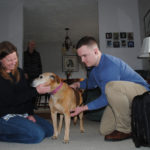 WENDY STIVER/THE EXPRESS Charlotte, a boxer mix, gets vet care in her Marsh Creek home from Dr. Andy VanGorder of Happy Paws Mobile Veterinary Clinic. With him is Gina Gramling, the practice’s manager. In the background is one of Charlotte’s owners, Vicki Confer.