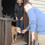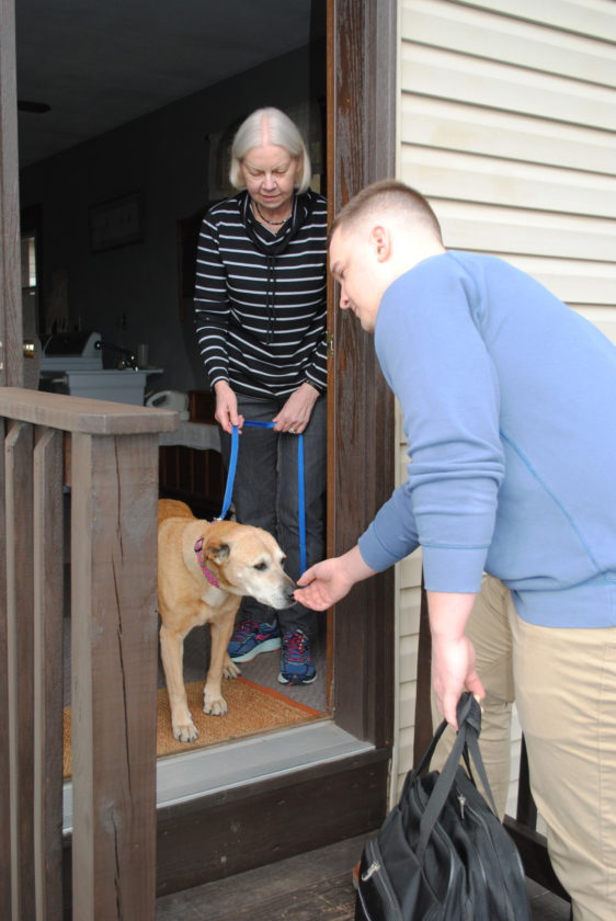 At left, Dr. VanGorder meets Charlotte, a boxer mix, at the door of her Marsh Creek home. Charlotte is 16 or 17 years old, according to owner Vicki Confer.
