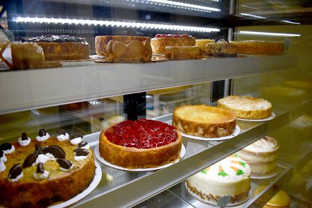 - LAURA JAMESON/THE EXPRESS A variety of cheese cakes and layer cakes with different flavors and toppings are on display in a refrigerated case in Simone’s Bakery.