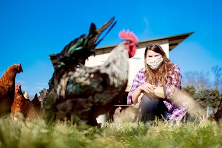 PHOTO PROVIDED Liz Wagner, owner-operator of Crooked Row Farm, feeds the chickens at the farm in Orefield on Friday, Nov. 20.