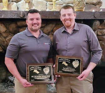 PHOTO PROVIDED Each year, Leadership Clinton County likes to celebrate milestone sponsors. Pictured, from left, is Aaron Hughes representing BHE GT&S for 10 years of sponsorship and Matt Boobar representing First Quality for 20 years of sponsorship.