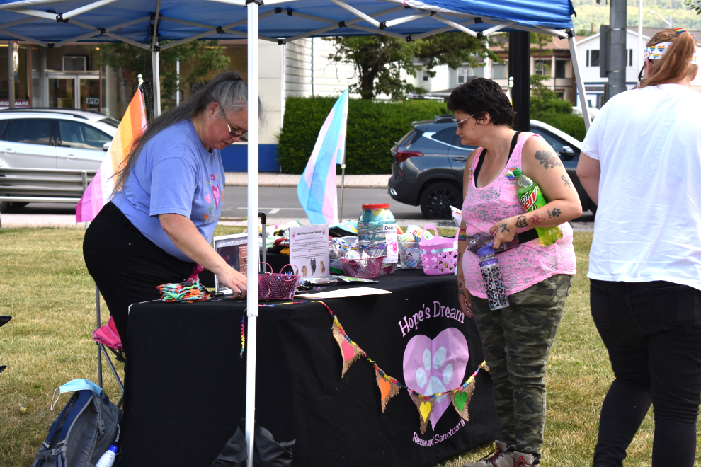 LAURA JAMESON/THE EXPRESS Booths for Hope’s Dream Rescue and Sanctuary, at top, and Fire Sphere Media, saw quite a number of customers during Friday’s Pride event held by Roads to Peace.