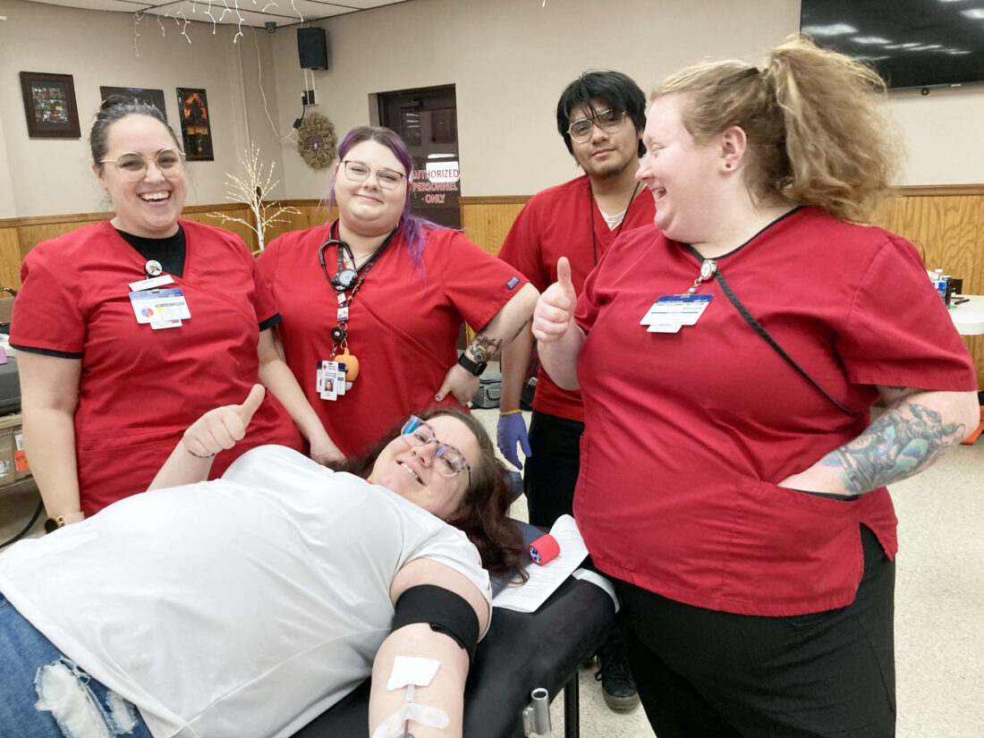 PHOTO PROVIDED Larissa Furl, one of many who donated at the blood drive, is surrounded by the Red Cross team, Katlyn Stasko, Maria Riccitelli, Jesse Guerrero and Ariel Rivera.