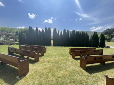 Directly off the second floor of the barn there is a large porch with a ramp leading to the ground level. To the right of this ramp is a “smoking area” with chairs and a cigarette receptacle to keep debris from the ground.