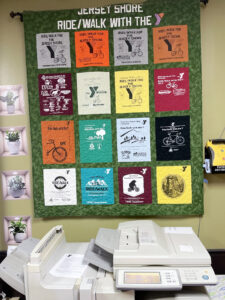 LAURA JAMESON/THE EXPRESS A quilt made by Rusty Jameson and donated by Keith and Marilee Handwerk showcases past t-shirts from previous Ride with the Y events. The shirts were created by Tiadaghton Embroidery.
