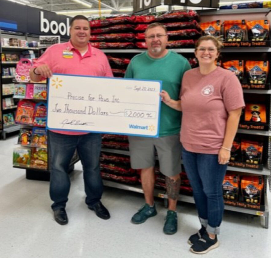 The Mill Hall Walmart recently made a donation to Precise for Paws in the amount of $2,000. Pictured in the photo from left are Justin Swinehart, Walmart store manager, Thomas Rossman and Kylie Rossman from Precise for Paws.
