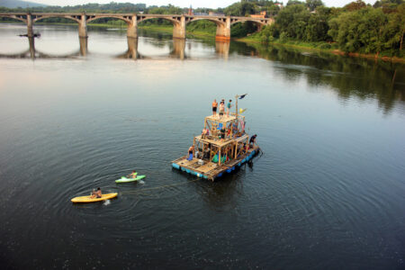 More recently in July 2023, a group of young adventurers set out from Falls, Pa. in a triple-decker raft guided by kayaks. A photo of the raft, by Julie Manwarren, took 3rd place in the 13th Annual Susquehanna Greenway Photo Contest as the raft floated by Pittston, Pa. She remarks, “The boys reported that all along the river, people were waving at them, cheering them on.” This adventure has become an annual tradition for the group, which began in 2019 with a small platform on barrels and has since grown with each journey.
