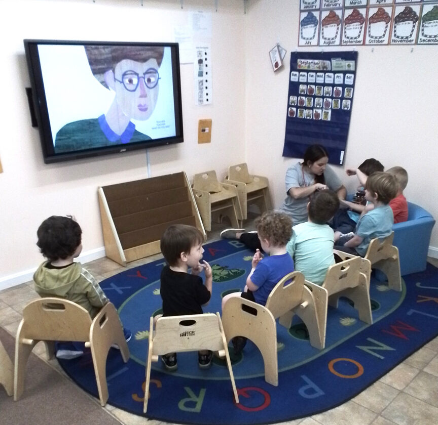 Students at the Infant Development Program in Lock Haven incorporate a Smart Board while reading a book to incorporate new skills.