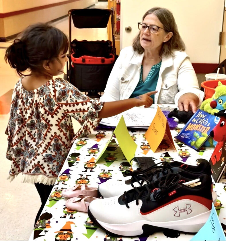 PHOTO PROVIDED Diahann Claghorn, director of the Lock Haven Area Shoe Bank, talks with a young girl about shoes, books and more at a Head Start event held Oct. 1.