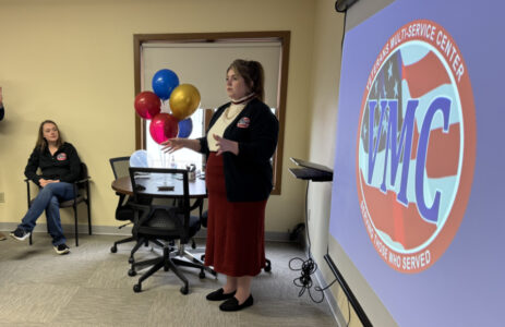 Over 50 community members turned out for Veterans Multi-Service Center’s Open House and Landlord Fair, 8 N. Grove St., where VMC staff and local officials cut the ribbon, celebrating the company’s location in Lock Haven. The event featured informational sessions, tours of the facility and gave the community the chance to learn more about what services VMC offers. VMC Program Manager Heather Hewitt said the service provide offers the ability to fill in gaps for veterans where they need it most. This includes housing assistance and other services to help veterans become independent. To learn more about VMC, you may visit www.vmcenter.org/. Above, VMC staff and local officials cut the ribbon. At right, Hewitt speaks to local officials and community members at the Open House.
