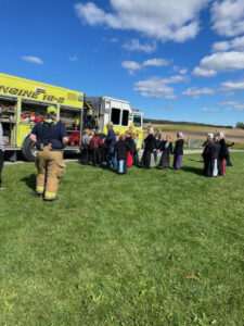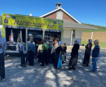 Members of the Walker Township Fire Company visited Amish schools in their coverage area on Thursday. Pictured here, students in Hublersburg learn about fire prevention and check out fire apparatus.