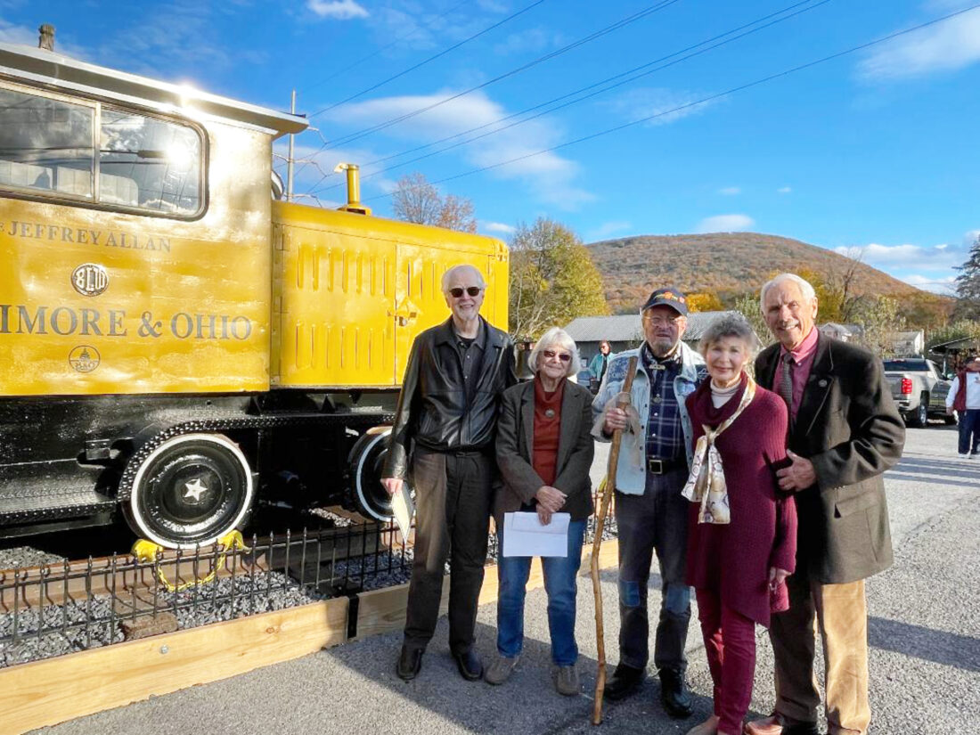The Clinton County Historical Society honored John and Joyce Gummo at the dedication of the “Yard Jockey” engine at the Castanea Railroad Station Complex on Nov. 2. The Gummos donated the restored engine, “The Jeffery Allen,” in memory of their son Jeffery Allen Gummo. President Bonnie Hannis thanked the supporters, Williamsport Crane and Rigging, Jersey Shore Steel, Bryertech Construction, Stephen Poorman and James Berkebile, who worked to place the engine on site. The engine joins the Gummo-restored boxcar and two cabooses at the site. Pictured are, from left, Steve Poorman, Bonnie Hannis, Luther Jette “King of the Hobos,” and Joyce and John Gummo.