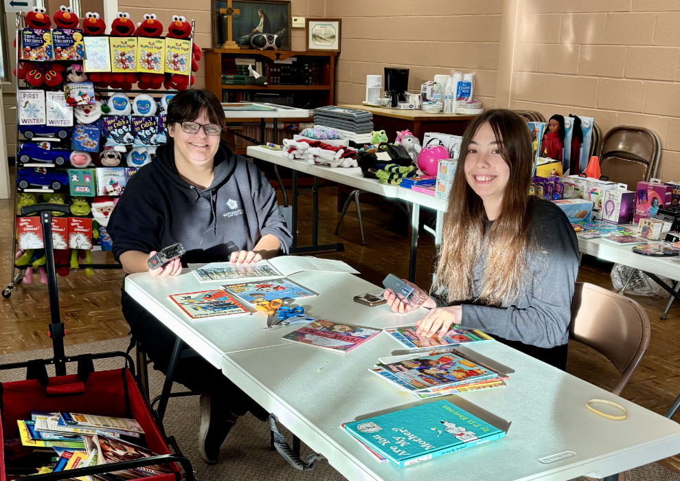 PHOTO PROVIDED Madison Peltz and Jenna Frank, students at Commonwealth University — Lock Haven, process new books for kids coming to the Lock Haven Area Shoe Bank. Eligible kids and teens can get free new boots and shoes on Saturday, Dec. 13.