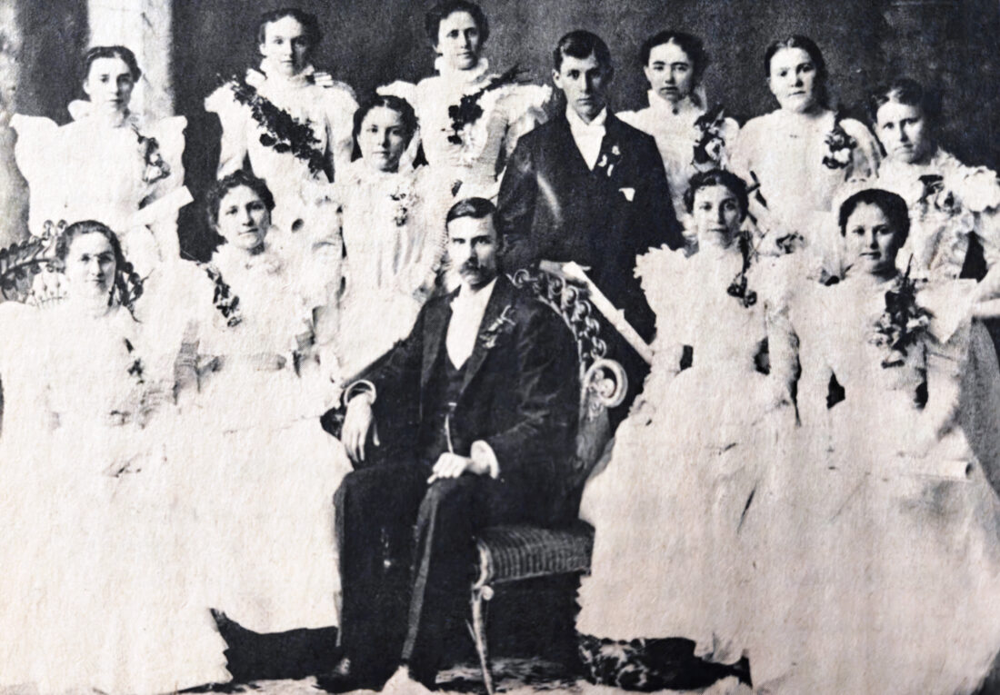 This photo from 1898 shows the first class of Mill Hall High School, in 1898. The Mill Hall High School is now the elementary school. Those in the class were: back row, from left, Pearl Chandler, Helen G. Flanigan, Eva Rosser, Annie Chatham, Blanche Irvin and Della Masden; front row, Bertha Watson, Etta Eckley, Maude Hunter, Thomas Rosser, Leone Bartholomew and Effie Hunter. The faculty member in front was Prof. B. J. Bowers. As of 1971, when the photo previously ran in The Express, the photo was owned by Mrs. Helen G. Truckenmiller, of W. Water St., Mill Hall. As of 1971, all of the class was deceased except for Chandler and Flanigan.