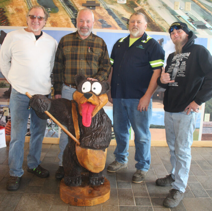 “We’re happy to help — this is a situation where everybody wins,” said Landfill Manager Jay Alexander as he and Jim Anderson accepted the newly-carved bear at the Landfill’s administration building. “Jim repurposes out what logs we donate, sorting by species, age and make-up. Then he coordinates delivery of the logs for the event.”