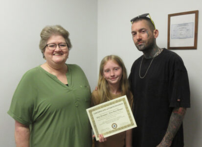 TAMMY COAKLEY/THE EXPRESS First place winner of the 2026 Americanism Essay Contest and fourth grader at Liberty Curtin Elementary, Elise Brungart, is shown holding her certificate presented to her by the Beech Creek American Legion Auxiliary on March 31, 2026. Elise is shown with her father, Mark Brungart, and her aunt, Vanita Watson.