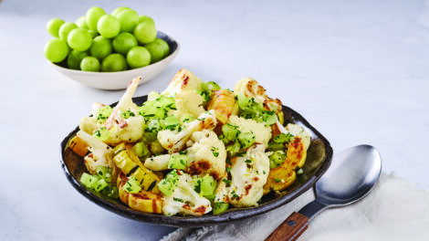 Blooming the spices in the microwave deepened their flavors for an even bolder dressing. Chickpeas further echoed the Moroccan theme and lent heartiness, and crisp romaine combined with slightly bitter watercress made the perfect bed of greens for our toppings. Reserving a bit of the dressing to drizzle on just before serving made the flavors pop.
