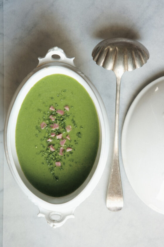 Pureed soups cry out for embellishment. We favor heavy cream, whipped or not; sour cream; snipped chives or minced scallions; or a drizzle of melted butter or olive oil to add more flavor. This minty pea soup from our cookbook “Canal House ” is topped with finely diced ham and lots of chives.