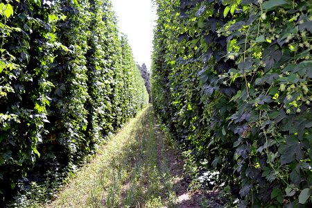 - PHOTO PROVIDED The 18-foot trellised hop plants form green walls over the farm.