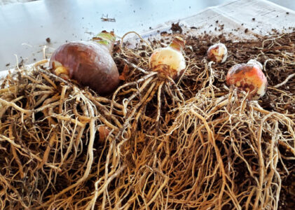 PHOTO BY DEBRA BURROWS The original bulb and bulblets separated with roots preserved.