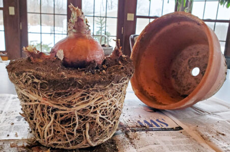 Once the bulb and bulblets are separated, I select new pots based on the size of the bulbs and bulblets. The pot must have good drainage holes and should be about twice as tall as the bulb and wide enough to allow about two inches from the sides of the bulb to the sides of the pot when the bulb is placed in the center of the pot. Amaryllis like to be somewhat pot bound, so it’s important to allow some room for root growth, but not too much.