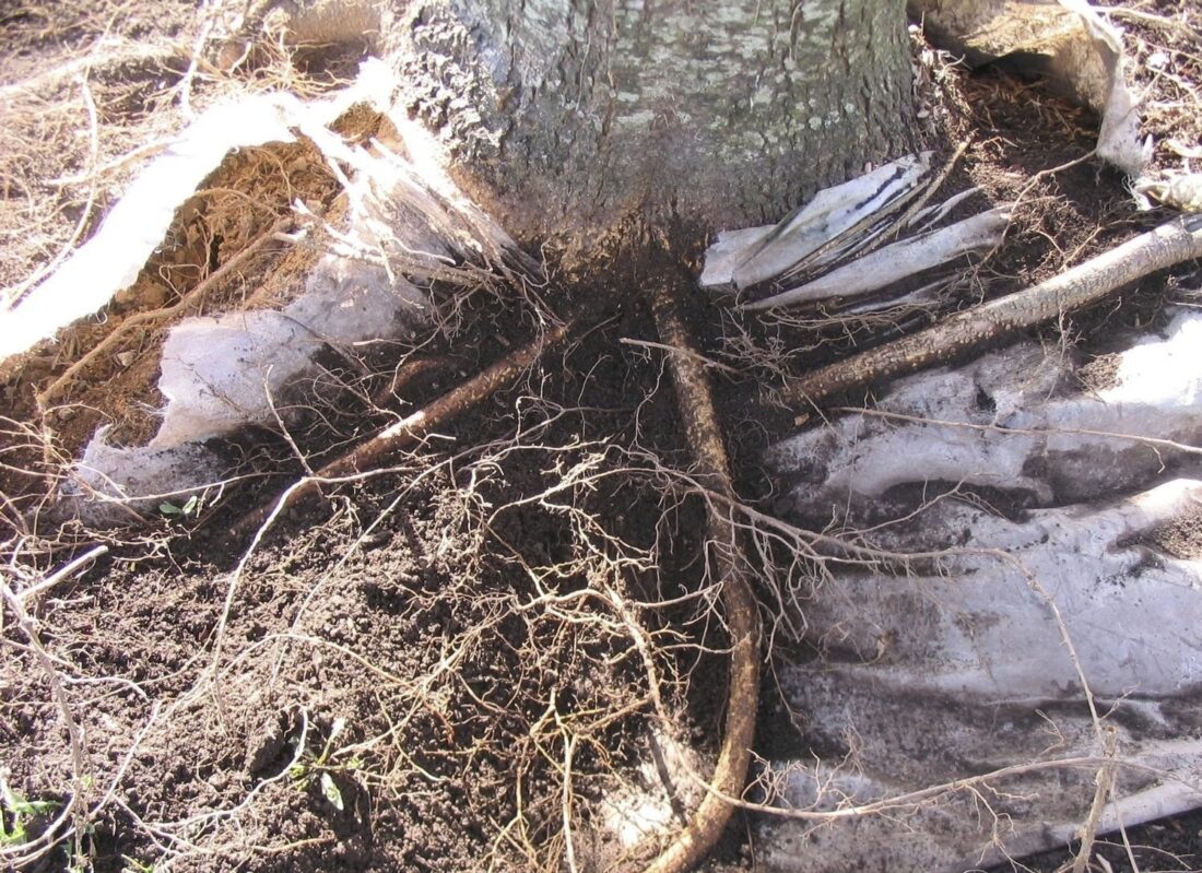 Joe Murray/Treebio.com/Bugwood.org This 2010 image provided by Bugwood.org shows tree roots that have become tangled up in landscaping fabric. When this occurs, root growth is restricted, which negatively impacts tree or plant health.