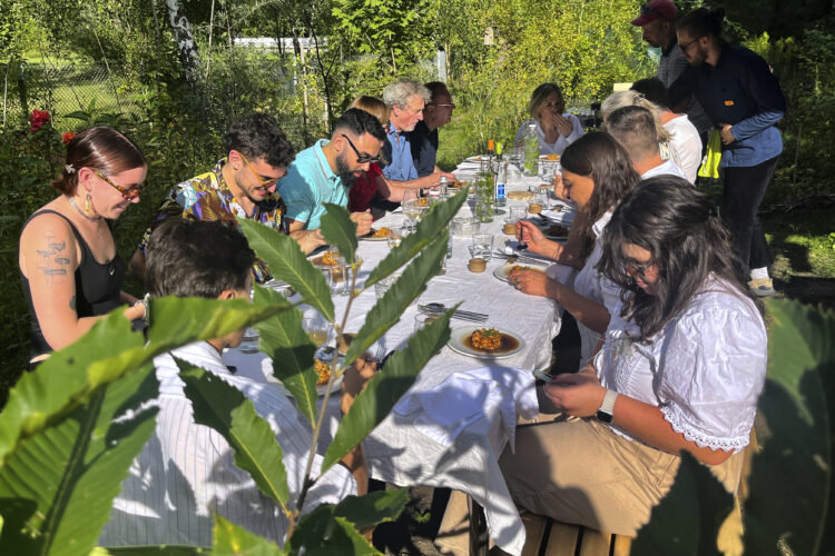 Visitors attend a joint meal at Martin Roetzel’s ‘The Monk Garden’ in Berlin, Germany, Sunday, Aug. 17, 2025. (AP Photo/Fanny Brodersen)
