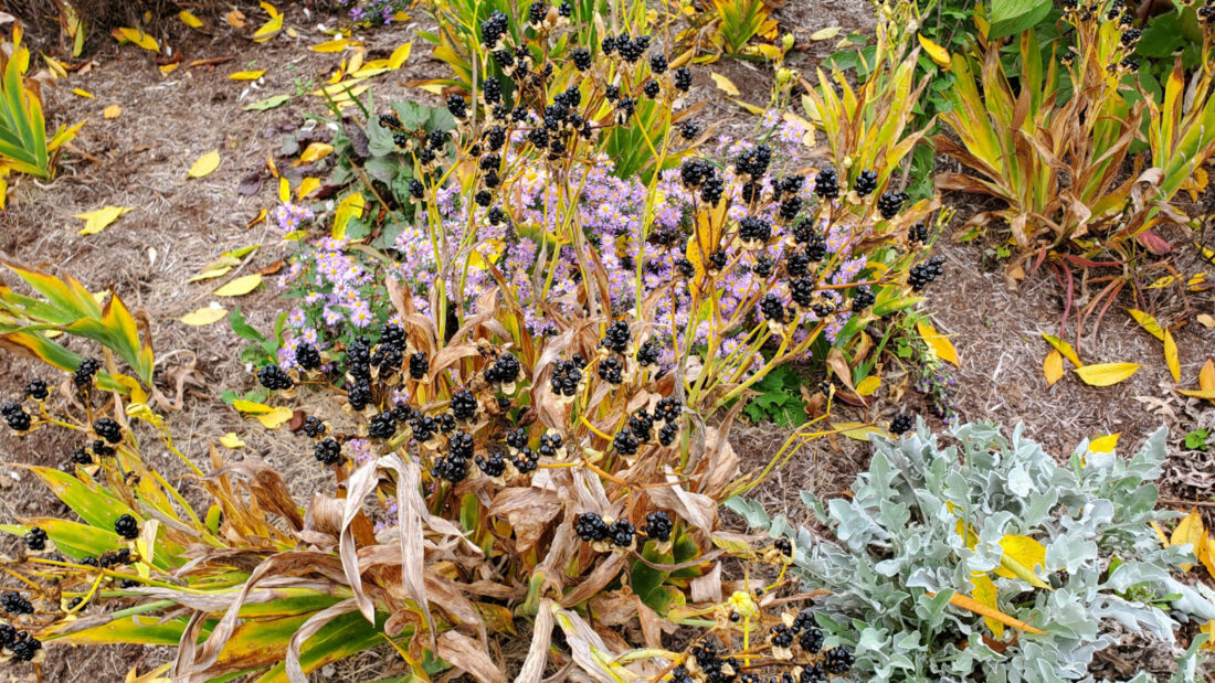 PHOTO BY DEBRA BURROWS Autumn leaves have begun falling into this bed of perennials where they will remain undisturbed to improve the soil and protect both plants and wildlife.