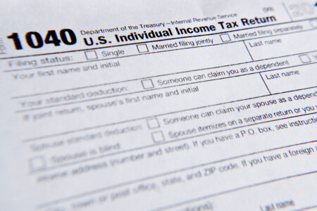 A 1040 tax form printed from the Internal Revenue Service web page is seen, Feb. 13, 2019, in Zelienople, Pa. (AP Photo/Keith Srakocic, File)