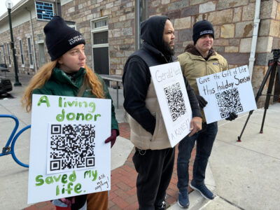 AP Photo/Mark Scolforo Riley Brubaker, left, Gerald Cameron and David Krissman, right, spread the word about the need for kidney donors on Saturday, Dec. 13, outside Broad Street Market in Harrisburg, Pa.