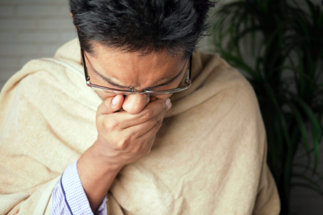 Towfiqu Barbhuiya via unsplash A man is pictured wrapped in a blanket and covering his nose.