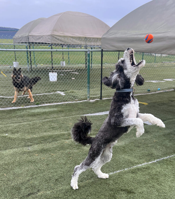 - PHOTOS BY KARYN STRATTON River is pictured performing a mid-air catch while a neighbor looks on jealously.
