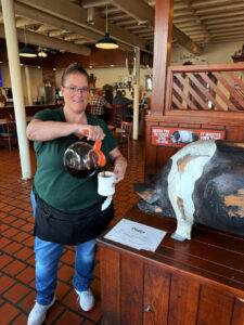 PHOTO PROVIDED One of Fox’s many fine waitresses pours coffee next to the life-size wooden pig on display at the restaurant.