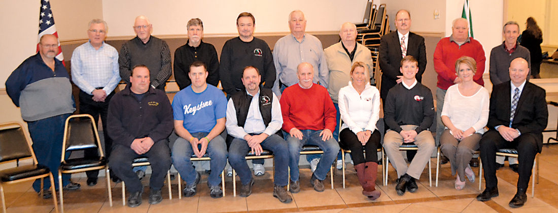 BOB ROLLEY/THE EXPRESS Representatives of sports-related groups that received donations from the Sons of Italy Lodge 146 are soon with lodge representatives. From left are, in front, Eric Brungard, Pat Johnson, Dan Vilello, Abe Stauffer, Cathy Brown, Patrick Long, Shannon Walker, and Paul Ciami; and in back: Keith Duvall, Steve Acquino, Ken Fisher, Alan Black, Steve Tasselli, Steve Laubscher, Bill Sementelli, Craig Miller, Dennis Caprio and Scott Moore.