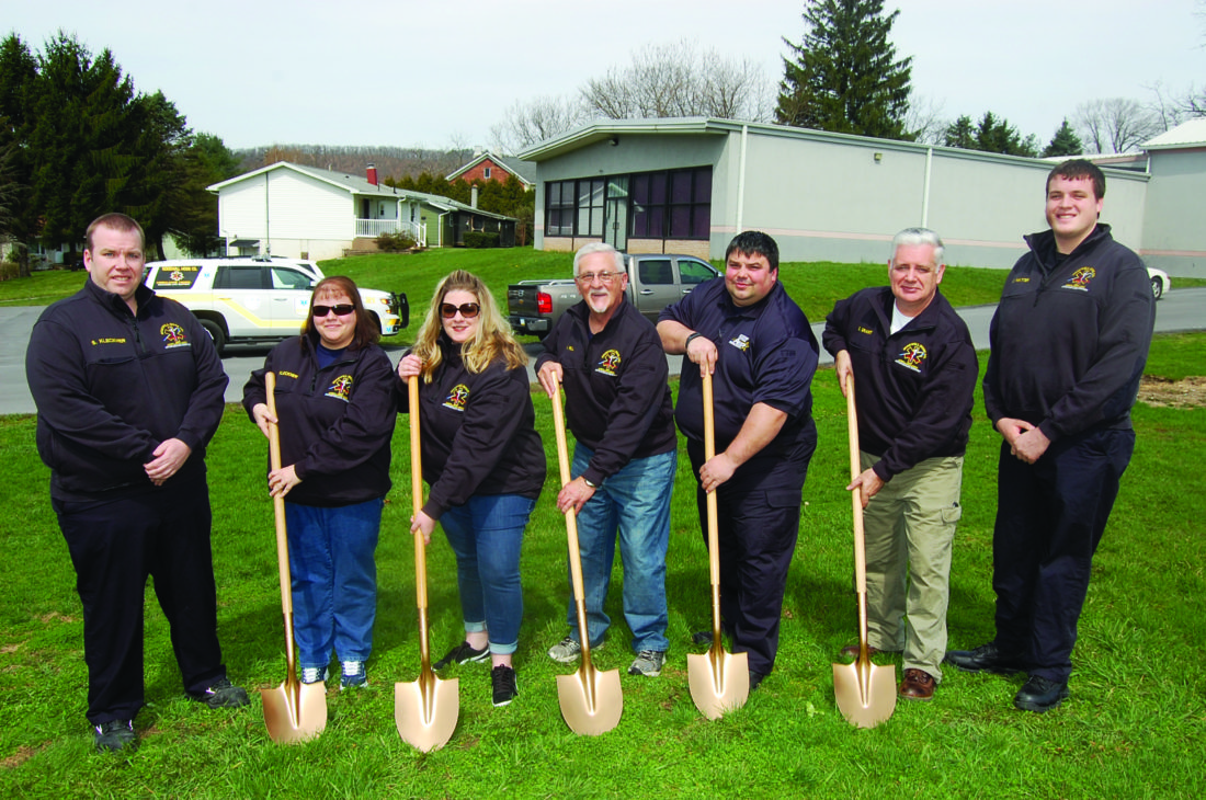 JIM RUNKLE/THE EXPRESS Members of the Goodwill Hose Co. Ambulance Association in Flemington broke ground yesterday on the future site of their new six-bay structure, at 312 Canal St. From left are Sean Kleckner, chief; Katie Kleckner and Traci Kuntz, board members; Albert Hill, board president; Brandon Coleman and Don Grant, board members; and Seth Matter, assistant chief. Board members Lori Reamer and Kerry Stover Jr. weren’t available for the photograph.